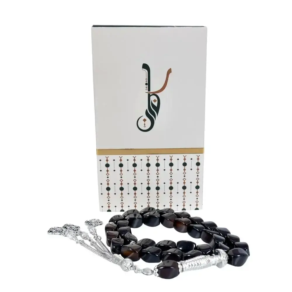 الخبراء يدركون قيمة الحجر. هذه السبحة مصنوعة من العقيق البرازيلي، وهو حجر طبيعي معروف بمتانته وقدرته على تحمل الاستخدام اليومي. المزيج الأسود المعرق بخطوط عسلية يمنح كل سبحة طابعاً فريداً، مما يجعلها قطعة شخصية لا تتكرر.